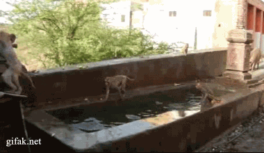 Wathc monkeys jump into a fountain at the Sun Temple, Jaipur, India might be the awesomest water fun thing to do for them. Mix this with some decent cocktails, lady